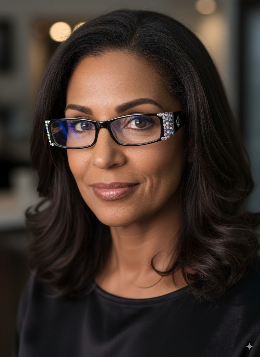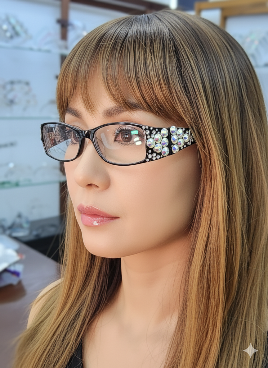 Hand Crystalized in the USA with Genuine European Crystals. Comes with a Soft matching case. Flexible Material. Spring Temple. Optical Quality Lens...